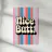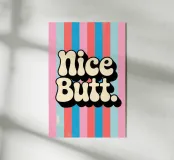 "Nice Butt." in caratteri grandi e decisi su uno sfondo a righe. Il rosa e l'azzurro pastello creano un'atmosfera elegante e giocosa: un design colorato e spiritoso con una tipografia moderna.