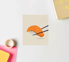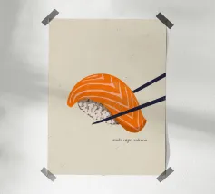 "Sushi Nigiri Salmon" mette in risalto l'arte della cucina giapponese con una vibrante fetta di salmone fresco appoggiata su un riso delicato. Questo poster minimalista celebra la semplicità e l'eleganza, evocando il fascino irresistibile dell'autentico sushi artigianale.