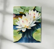 Questo elegante e sereno acquerello cattura la delicata bellezza di due ninfee bianche e rosa che galleggiano pacificamente su uno stagno blu intenso. I petali morbidi e stratificati dei fiori sono messi in risalto dalla calda luce del sole, proiettando ombre delicate che creano un senso di profondità e tranquillità. Le ninfee verdi circondano i fiori e i loro riflessi scintillano sulla superficie dell'acqua calma. Questo pezzo evoca una sensazione di pace e armonia naturale, rendendolo un'aggiunta perfetta a qualsiasi spazio che cerchi un tocco di calma ed eleganza naturale.