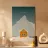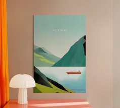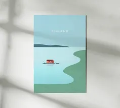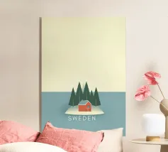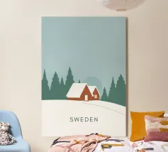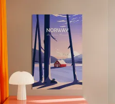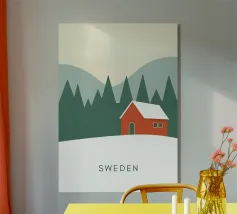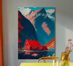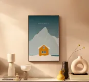 Design minimalista della Norvegia con una piccola capanna gialla sulla costa norvegese delle Isole Lofoten con le montagne sullo sfondo. Tipico cottage scandinavo coperto di neve e paesaggio montano invernale nel nord della Norvegia.