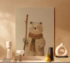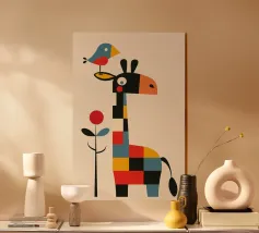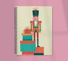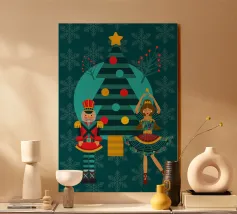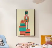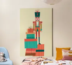 Un'illustrazione digitale giocosa e colorata di un classico soldatino schiaccianoci che si erge fiero accanto a una torre di regali incartati. Con la sua affascinante tavolozza di metà secolo e l'atmosfera festosa, questa opera d'arte porta l'allegria delle feste e il calore nostalgico a qualsiasi parete. Perfetto per un interno natalizio elegante e gioioso.