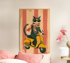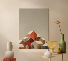 Un'illustrazione digitale giocosa e colorata di un classico soldatino schiaccianoci che si erge fiero accanto a una torre di regali incartati. Con la sua affascinante tavolozza di metà secolo e l'atmosfera festosa, questa opera d'arte porta l'allegria delle feste e il calore nostalgico a qualsiasi parete. Perfetto per un interno natalizio elegante e gioioso.
