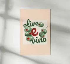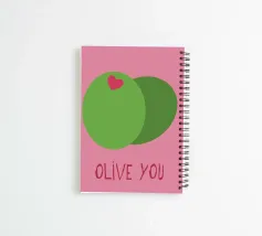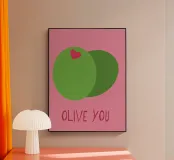 A whimsical green olive with a red heart sits against a pink background, accompanied by the playful phrase "Olive You." The design combines humor and affection, making it a fun visual pun.