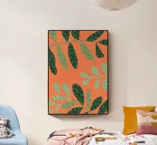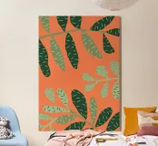 A simple yet striking pattern of various green leaf shapes scattered across a vibrant orange background. The high contrast makes the botanical forms pop, creating a fresh and modern design.