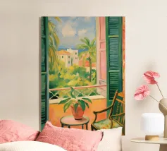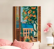 A view through a window of a beautiful orange tree, heavy with ripe fruit. The warm, sun drenched light and charming subject create a scene of rustic, Mediterranean abundance.