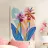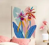Un'illustrazione splendidamente dettagliata cattura l'eleganza di un'orchidea in fiore, con vibranti petali rosa, bianchi e gialli contrapposti a foglie blu intenso.