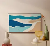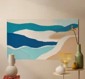 Una dinamica composizione costiera astratta realizzata con strati strappati di carta strutturata nei toni del blu, del crema e della sabbia. I bordi sovrapposti imitano il flusso naturale della costa e delle onde, creando un senso di movimento e di profondità stratificata in un quadro moderno e minimale.