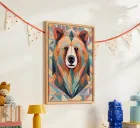 This captivating artwork reimagines the noble bear in an abstract, geometric style. With muted tones of blue, orange, and soft peach, the design combines natural elements with modern aesthetics. The bear’s face, set against a background of abstract trees and moonlit sky, conveys both tranquility and strength. The careful use of color and form gives this piece a contemporary yet calming feel, perfect for anyone who loves the outdoors or unique, artistic depictions of animals. This design is perfect for both kids and adults, making a striking statement on clothing, accessories, or home decor.