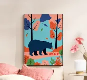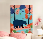 Godetevi la bellezza naturale di una foresta autunnale con questa illustrazione di un orso in cerca di cibo. I colori caldi e il design minimalista creano un'atmosfera pacifica e rasserenante.