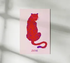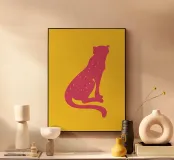 La silhouette rosa di un'oncia di grandi dimensioni è incastonata creando un contrasto sorprendente. Il gatto è decorato con piccole macchie irregolari che gli conferiscono un aspetto unico e giocoso.