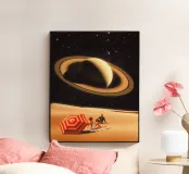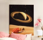 A retro-futuristic collage by Taudalpoi depicting a couple having a romantic date in the desert dunes with Saturn and the starts behind them.