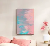 Splendida arte astratta fluida, ispirata a una tranquilla spiaggia rosa, con flussi di colore in blu acqua e rosa pastello.