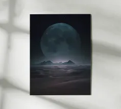 Intraprendete un viaggio ultraterreno con questa stampa d'arte drammatica e altamente dettagliata, che cattura uno splendido paesaggio lunare monocromatico. L'opera presenta una scena desolata ma bellissima di un terreno pieno di crateri che lascia il posto ad ampie colline simili a dune, il tutto reso in suggestive tonalità di nero, bianco e grigio. Un'enorme luna crescente si staglia nel cielo scuro, proiettando sulla scena un bagliore oscuro e ultraterreno. Quest'opera d'arte combina magistralmente la texture di una superficie craterizzata con le curve eleganti di un deserto alieno, creando un potente senso di profondità e scala. Perfetto per un ambiente moderno o industriale.
