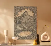 Paesaggio montano con laghetto e cornice floreale plexiglass
