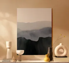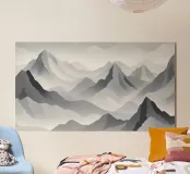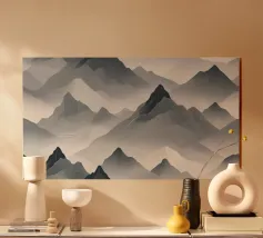 Un'affascinante catena montuosa appare nei toni del grigio, evidenziando le cime e le valli. Le morbide transizioni tra i toni creano un'atmosfera serena e misteriosa.