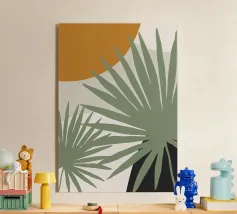 Questo dipinto piatto minimalista cattura una drammatica fronda di palma che scende in diagonale su una calda parete color crema, la cui silhouette è elegantemente proiettata in una morbida ombra color oliva. A lato, un arco costiero rivela un cielo pastello, dune dorate e una striscia di acqua turchese. Il gioco di luci, forme e sottili sfumature di colore evoca una raffinatezza rilassata e una calma mediterranea senza tempo, ideale per interni moderni e sereni.