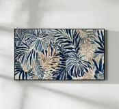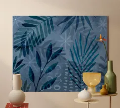 A modern botanical composition exploring rhythm and repetition through sweeping palm fronds in indigo, sand, and bone. The layered gouache strokes evoke movement and shadow, capturing the balance between structure and spontaneity found in nature.