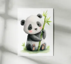 Illustrazione colorata di un simpatico panda con un ramo di bambù. Il motivo giocoso combina cordialità, calma e aree di colore moderne - ideale per i fan dei panda e per i disegni creativi di animali.