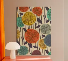 Fiore d'ispirazione moderna di metà secolo, con papaveri, foglie in grassetto e sfondo a griglia retrò nei toni smorzati dell'arancione, del verde e del beige.
