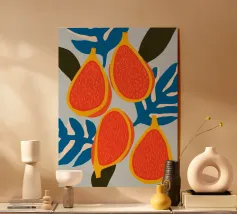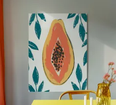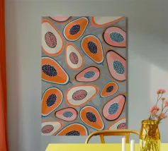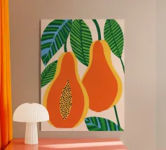 Un'illustrazione vivace e stilizzata di papaya a fette con foglie verde scuro su uno sfondo chiaro. Il motivo ripetitivo e il colore arancione brillante creano un'atmosfera fresca e tropicale.