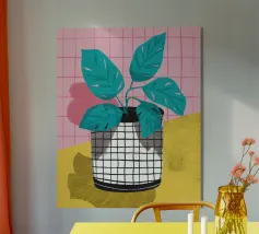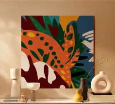 Una lussureggiante scena di giungla incornicia un grappolo d'uva viola, creando una natura morta unica e inaspettata che fonde il fogliame tropicale con la frutta del frutteto in una composizione vibrante.