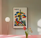 A bold, graphic tribute to Paris, reimagined through clean geometry and vibrant colour blocking. Iconic landmarks rise in layered harmony, with the Eiffel Tower at the centre, framed by stylised clouds and architectural forms that give the composition rhythm and balance. The flat shapes and confident contrasts create a timeless poster aesthetic that feels both nostalgic and unmistakably contemporary.