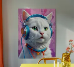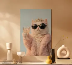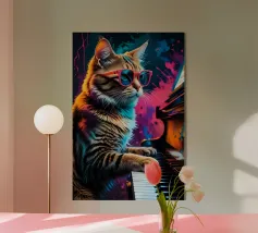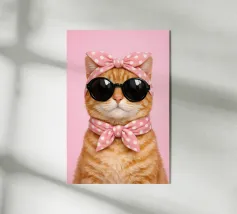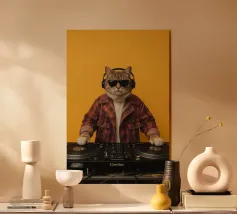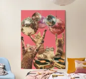 Diversi gatti con occhiali da sole sembrano partecipare a una festa in discoteca con palline a specchio e dischi in vinile. Il tutto è ambientato su uno sfondo rosa acceso e l'allestimento emana un'atmosfera giocosa e retrò.
