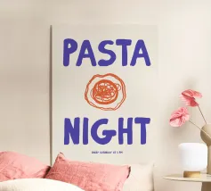 Un'illustrazione affascinante con un'atmosfera da tavola calda retrò e un umoristico romanticismo quotidiano: gli spaghetti sulla forchetta simboleggiano le serate insieme, i piccoli rituali e l'amore senza complicazioni. I colori vivaci, lo stile dipinto a mano e la tipografia giocosa fanno di questo poster una calda dichiarazione per la cucina o la sala da pranzo. Ideale per chi associa il buon cibo alle emozioni. Illustrazione contemporanea in stile arte moderna con una strizzata d'occhio nostalgica.