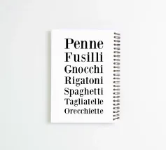 The text shows a vertical list of classic pasta varieties, elegantly arranged in clear, bold typography on a white background. With its minimalist aesthetic, the design exudes a timeless elegance that is both informative and decorative.