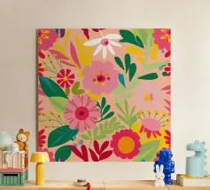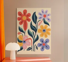 Una bella macchia di fiori selvatici stilizzati e stravaganti è illustrata in un affascinante stile ispirato all'arte popolare, con un delizioso mix di colori e forme che irradiano gioia e bellezza naturale.