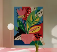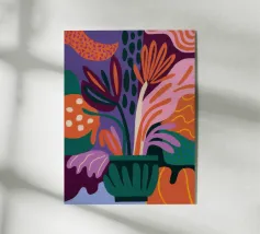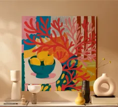 Una composizione astratta presenta una ciotola di fragole in mezzo a un turbinio di forme e motivi organici e colorati, creando un'interpretazione fresca e moderna di un classico dell'estate.