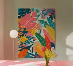Una composizione moderna e astratta caratterizzata da un patchwork di vari motivi e forme. Gli elementi includono forme organiche simili a foglie, griglie geometriche e texture astratte in una tavolozza tenue di rosa, nero e beige, che riflette uno stile bohémien ed eclettico.