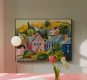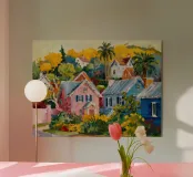 Un villaggio di case colorate di rosa, blu e giallo è adagiato sul fianco di una collina; la scena è composta come un'allegra trapunta patchwork di colori e forme, che emana un senso di comunità e gioia.