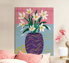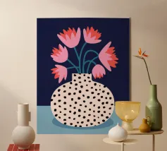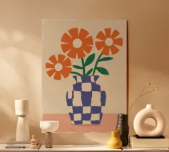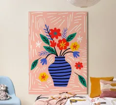 Un vaso a righe bianche e blu contiene fiori gialli e rosa, su uno sfondo vibrante, simile a una trapunta, con motivi floreali rosa, arancioni e rossi.