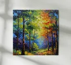 This vibrant oil painting captures the breathtaking beauty of a forest illuminated by sunlight. The artist uses a unique impasto technique, applying thick layers of paint to create a rich, textured surface that you can almost feel. The bold, expressive strokes bring the scene to life, from the deep purples and blues of the cool shadows on the left to the fiery oranges and yellows of the sun-drenched canopy on the right. A winding path invites you deeper into the woods, evoking a sense of peaceful exploration and the magic of nature. This piece is a stunning celebration of light, color, and the