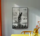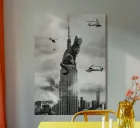 "This surreal collage transports the viewer to an iconic scene with an unexpected twist: a giant kitten perched atop the Empire State Building in New York. In a clear homage to the classic King Kong movie, the feline towers over the city with a mix of cuteness and might. The combination of the skyscraper's grandeur with the kitten's innocence creates an image that is as absurd as it is charming, turning a tense scene into a visual parody that brings smiles and sparks the imagination."