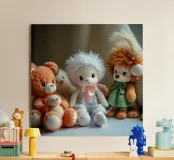 Peluche morbidi e colorati raccolti in un'accogliente stanza interna plexiglass