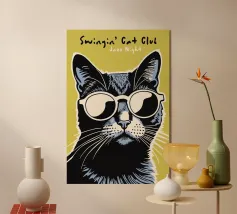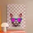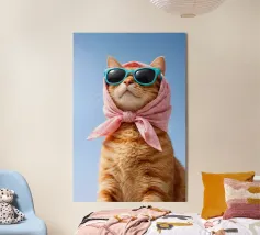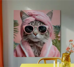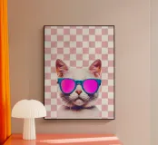 Un elegante gatto bianco che sfoggia audaci occhiali da sole su uno sfondo a scacchiera rosa di tendenza. Fresca, sicura di sé e senza sforzo chic, quest'opera d'arte conferisce un'estetica giocosa e moderna a qualsiasi spazio.