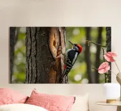 Picchio in cerca di cibo su un tronco d'albero in una foresta rigogliosa plexiglass