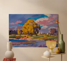 A landscape painting of a river bending through a meadow, with pine trees lining its banks. The grass is yellow and green, suggesting late summer or early autumn.
