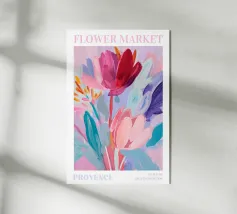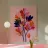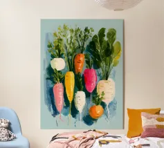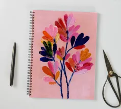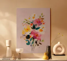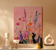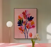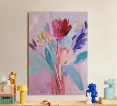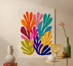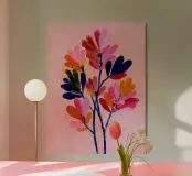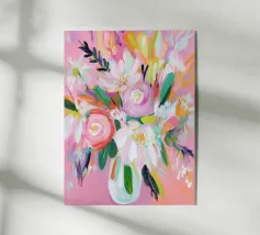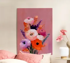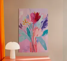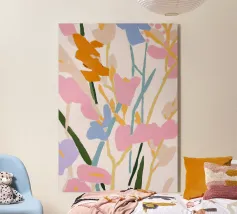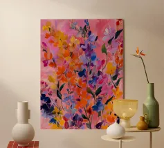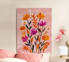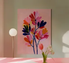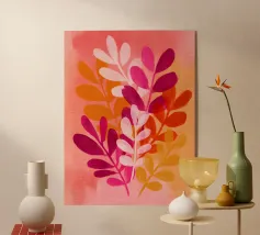 Vibranti forme botaniche nei colori corallo, magenta e viola si dispiegano su uno sfondo rosa. Quest'opera d'arte celebra la forza e la creatività femminile: una moderna dichiarazione floreale per gli interni che amano il colore.