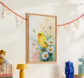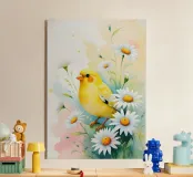 Pittura digitale di canarini gialli e margherite bianche plexiglass