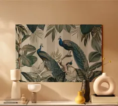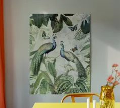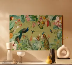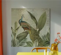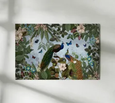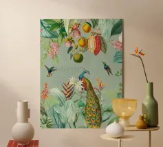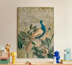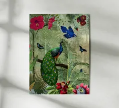 Questo collage vintage cattura l'eleganza dei tropici con una splendida composizione di lussureggianti foglie tropicali e frutti vivaci. Al centro, due splendidi pavoni si ergono con grazia, con le loro piume iridescenti che brillano nei toni del blu, del verde e dell'oro. Il maestoso piumaggio dei pavoni contrasta con il ricco fogliame, aggiungendo un senso di raffinata bellezza. Le sottili texture vintage dello sfondo esaltano l'eleganza generale, mentre i colori vibranti delle foglie e dei frutti danno vita alla scena, evocando un paradiso esotico senza tempo.