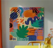 A playful and energetic abstract piece is filled with colorful scribbles, bold textures, and whimsical shapes in a palette of teal, orange, and beige, creating a sense of spontaneous, joyful creativity.