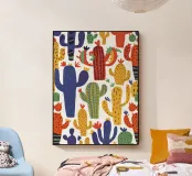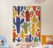 A playful and colorful pattern of various stylized cacti creates a fun, cheerful, and modern design that celebrates the quirky beauty of desert plants.
