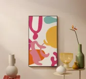 Una vivace composizione astratta di forme rosa, gialle e rosse che sembrano danzare sulla tela. L'opera è caratterizzata da un'energia giocosa, da forme semplici e da una tavolozza di colori vivaci e allegri.