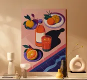 A poolside table features oranges, a bottle of juice, and a glass, surrounded by serene water and a relaxing atmosphere. The vibrant setup exudes freshness and tranquility.