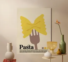 Questa opera d'arte aggiunge un tocco giocoso e classico a qualsiasi spazio. Perfetta per le cucine, le trattorie e gli amanti della pasta, è un modo elegante per portare il fascino vintage e l'atmosfera italiana nel vostro arredamento! Celebrate il fascino senza tempo della pasta con questo poster in stile retrò! Caratterizzato da un design audace e minimalista di una singola farfalla di pasta