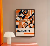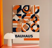 Un poster verticale visivamente accattivante, caratterizzato da un complesso mosaico modulare di forme geometriche interconnesse, tra cui cerchi, archi, quadrati e triangoli. Il design è un forte omaggio al Bauhaus e utilizza una palette calda e sofisticata di blu navy intenso, arancione brillante e tan/taupe, su uno sfondo color crema. La composizione è sostenuta dalla tipografia "BAUHAUS" in grassetto e in maiuscolo e dagli accenti arancioni in basso. Questo file digitale di qualità eccezionale (7000x5000 pixel, 300 dpi) è perfetto per un'arte murale modernista ad alta risoluzione che emana eccellenza nel design.