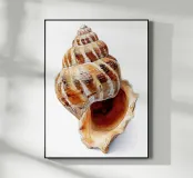 Poster acquerellato per la cameretta di un bambino con una splendida conchiglia nei toni naturali del beige, del marrone e dell'ocra. Un'illustrazione elegante e rilassante che evoca il mare e i tesori marini, perfetta per una decorazione murale morbida e poetica.